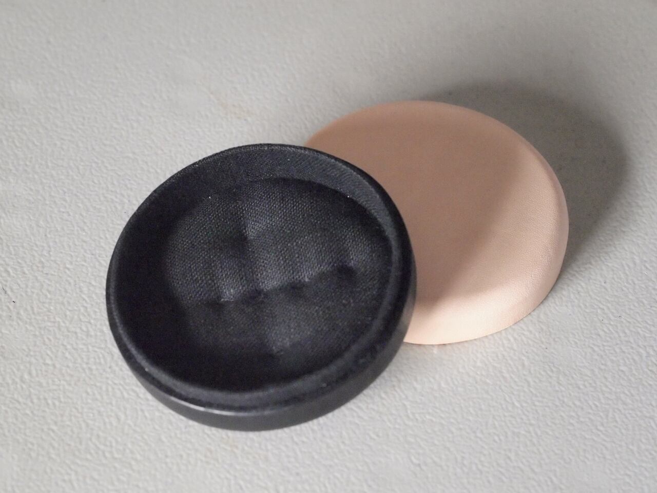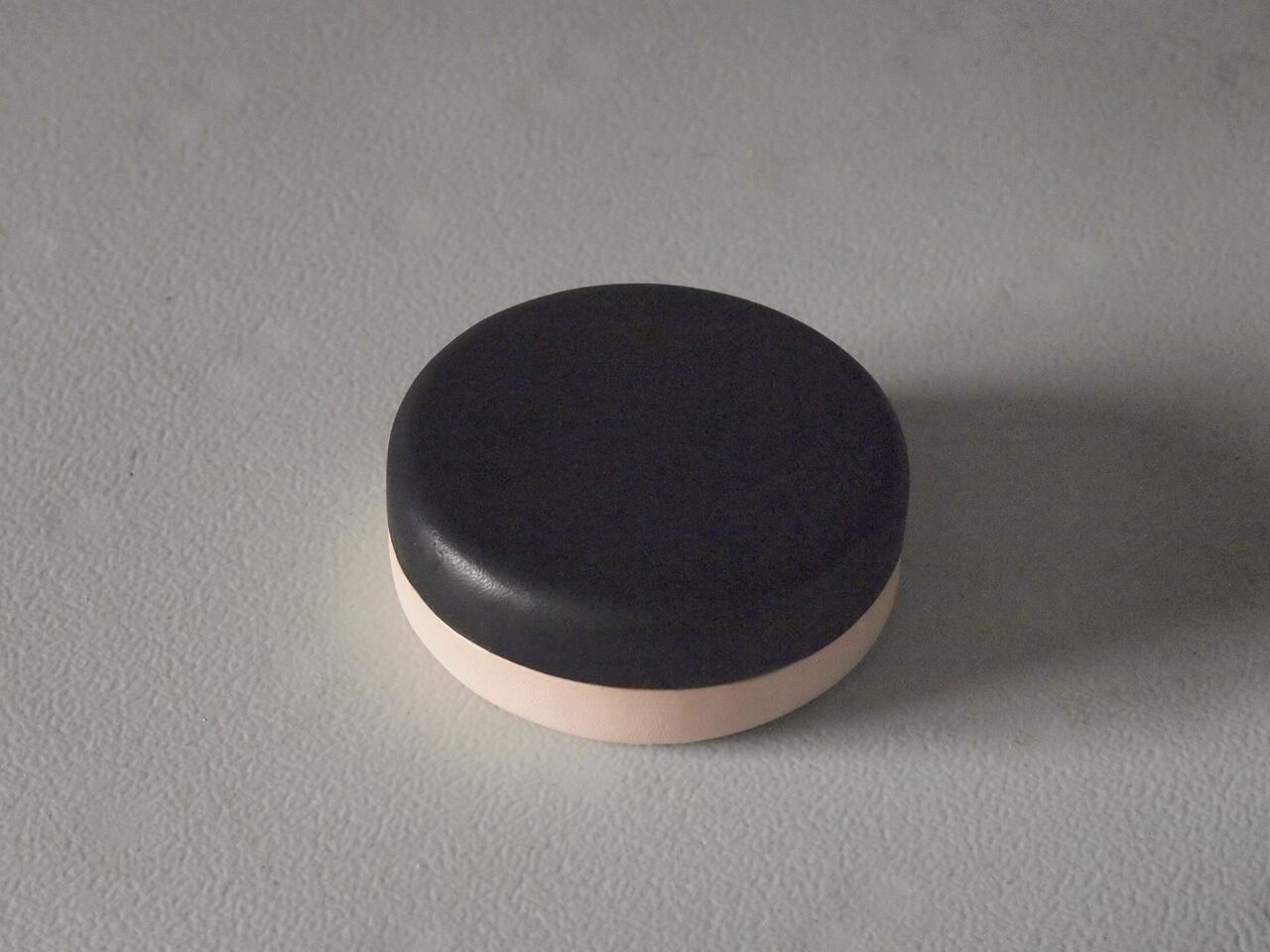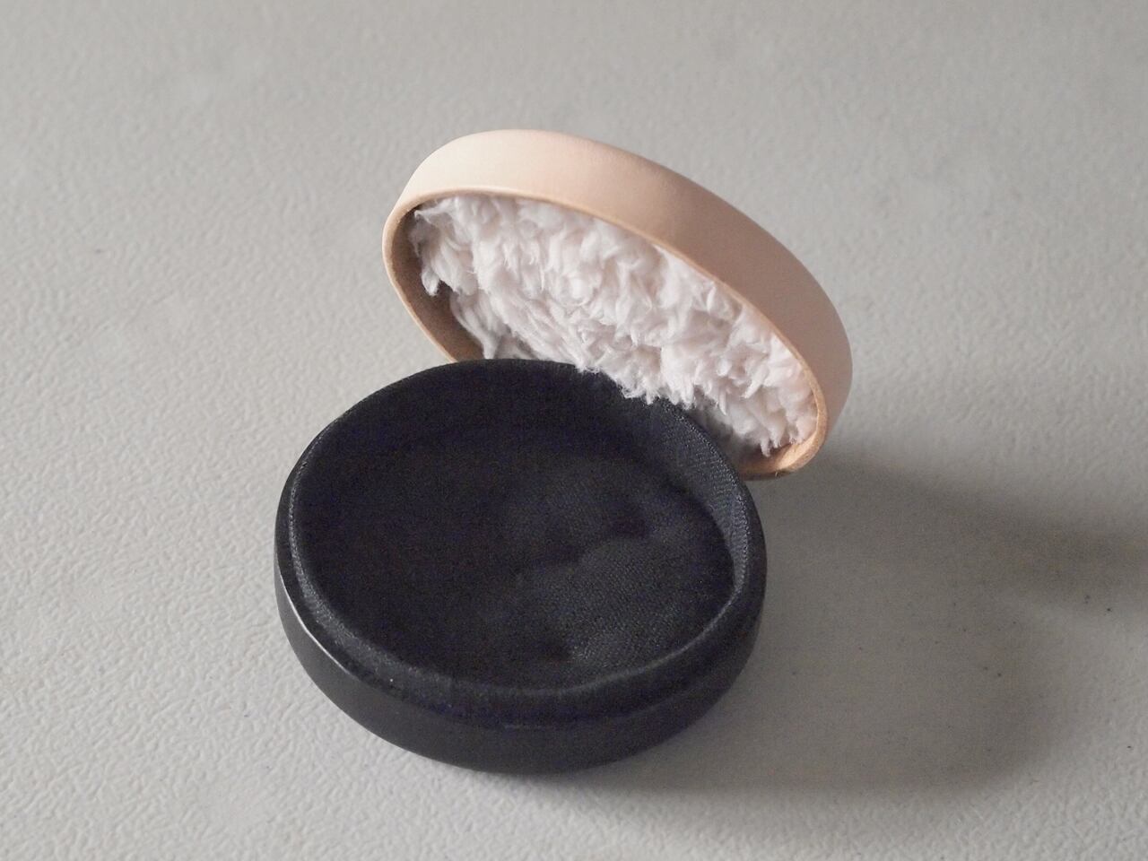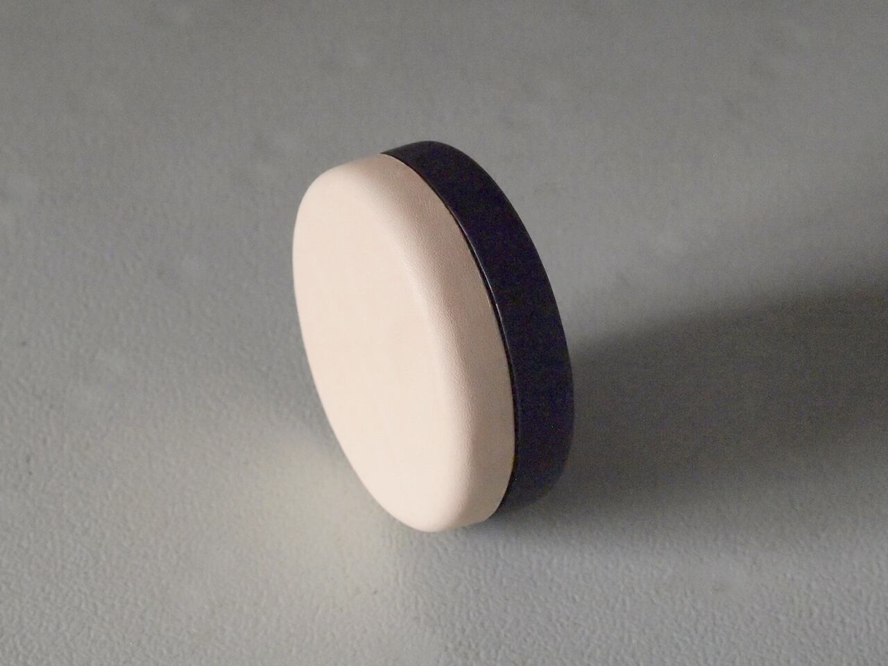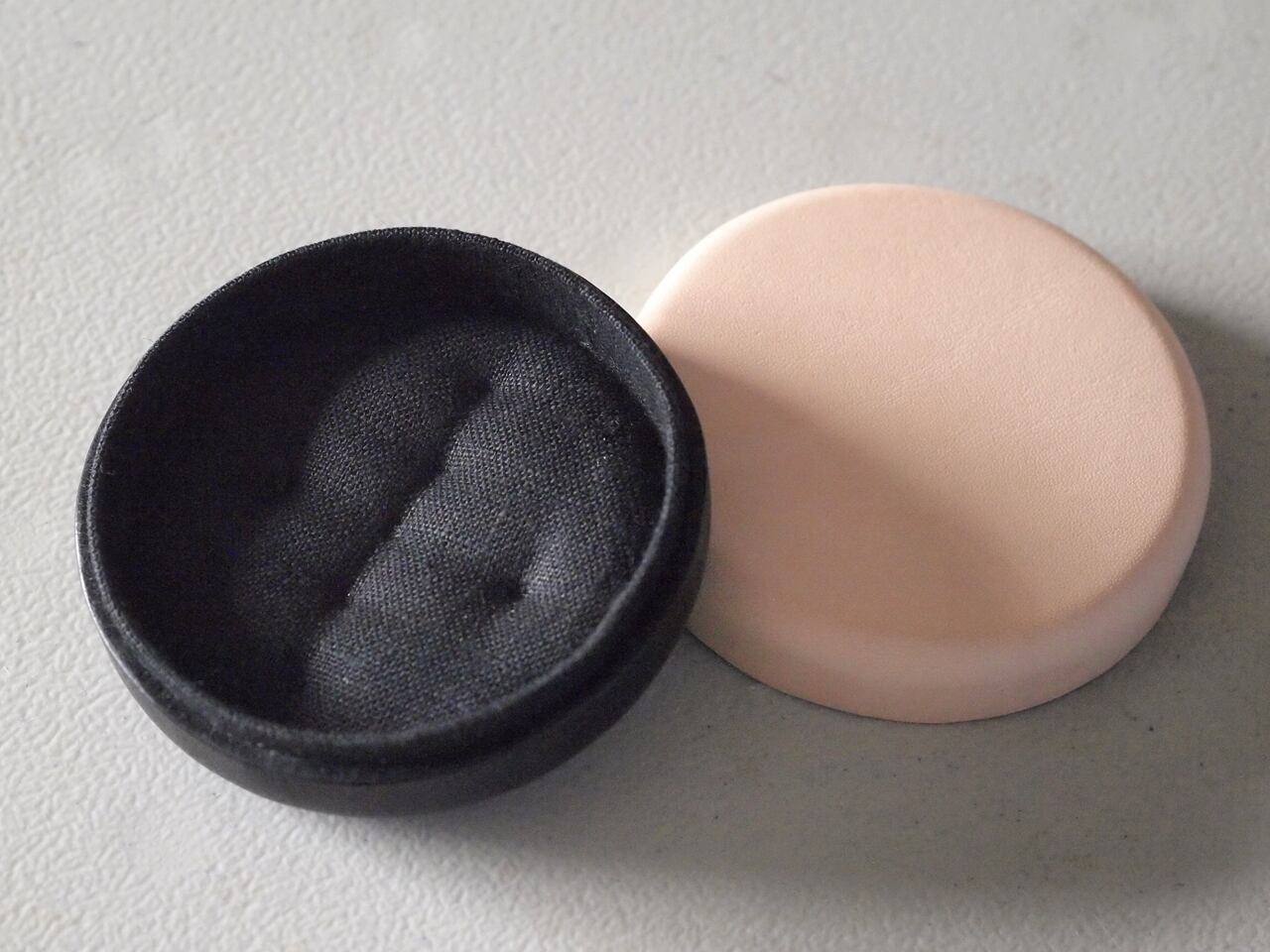 黒い革とヌメ革を組み合わせた丸くつるんとした箱です。