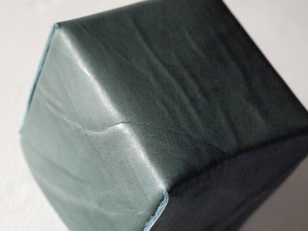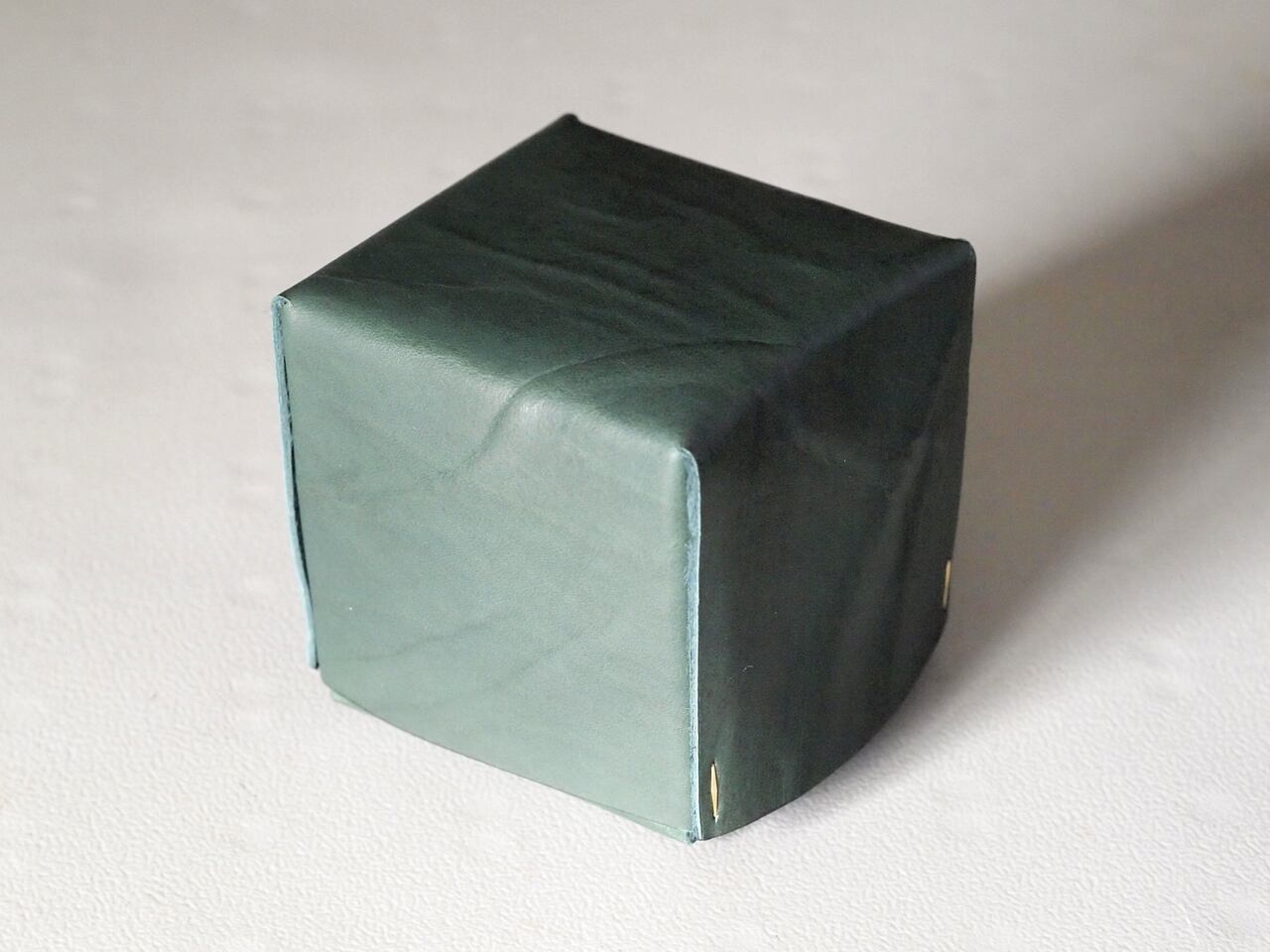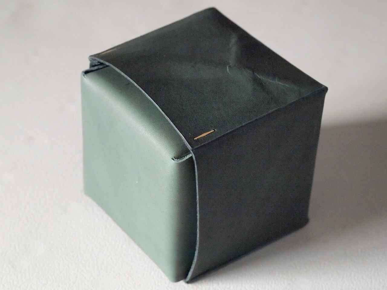 濃いグリーンに染色されたフルタンニン鞣しの牛ヌメ革を金具で留めただけのシンプルで柔らかい箱です。