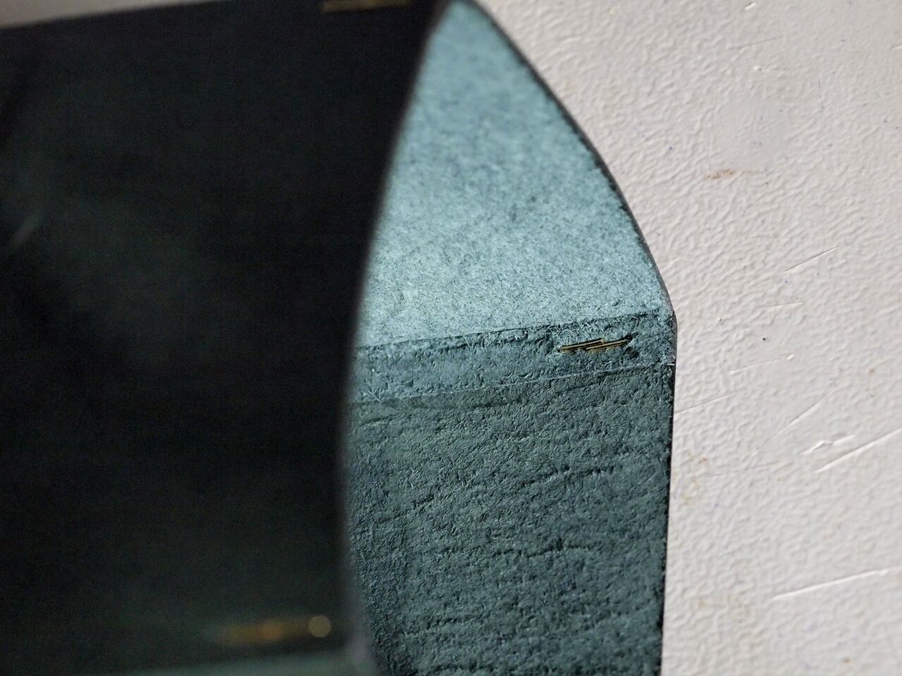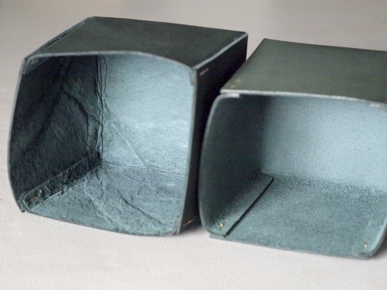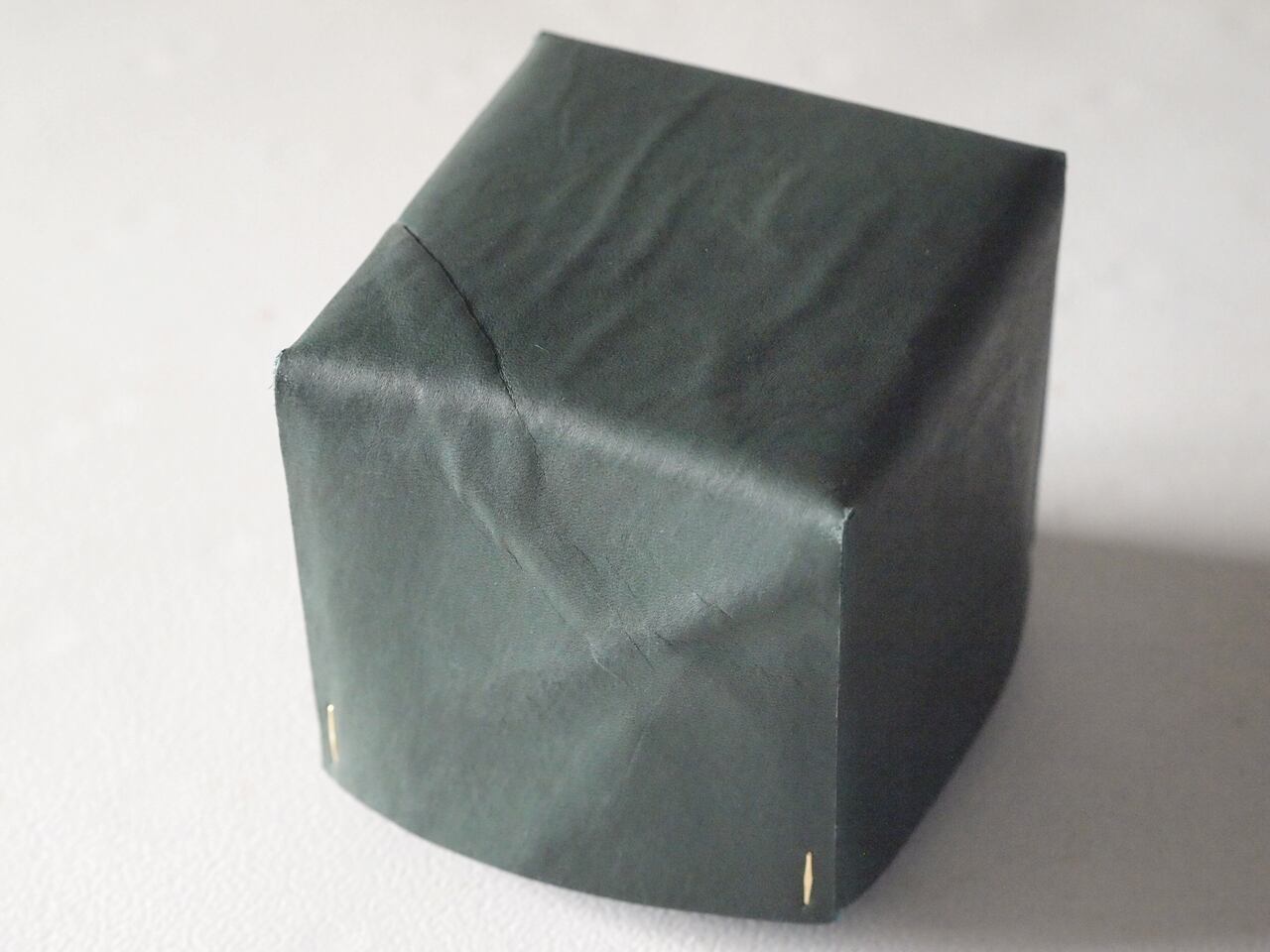 濃いグリーンに染色されたフルタンニン鞣しの牛ヌメ革を金具で留めただけのシンプルで柔らかい箱です。